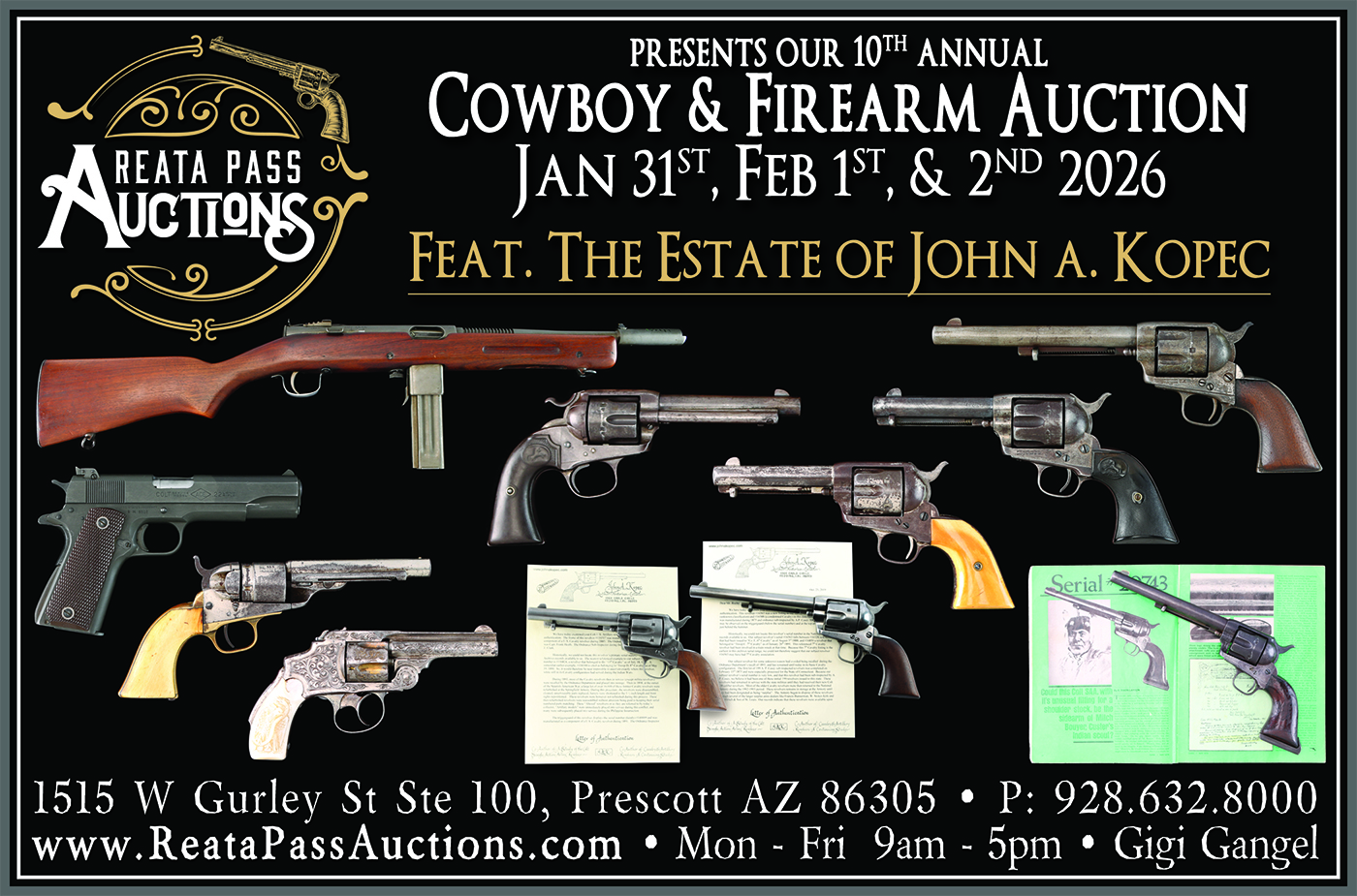 Reata Pass handles one item consignments as well has whole estates. We specialize in selling Firearms from Antiques to NFA firearms, Western Subject Fine Art, Fine Jewelry and have GIA appraisers who work with us to sell and appraise estate jewelry, Indian artifacts, baskets, bead work, pottery, textiles, and everything in between, Cowboy memorabilia High end collectors saddles, artwork, spurs, memorabilia, Wartime artifacts like Uniforms, Flags, and edged weapons. Also we sell Asian artifacts, political or historical documents, coins, ammo, gun accessories, small antiques, collectors books, animal mounts, Pre-Columbian artifacts, and most things that have a collectors value.